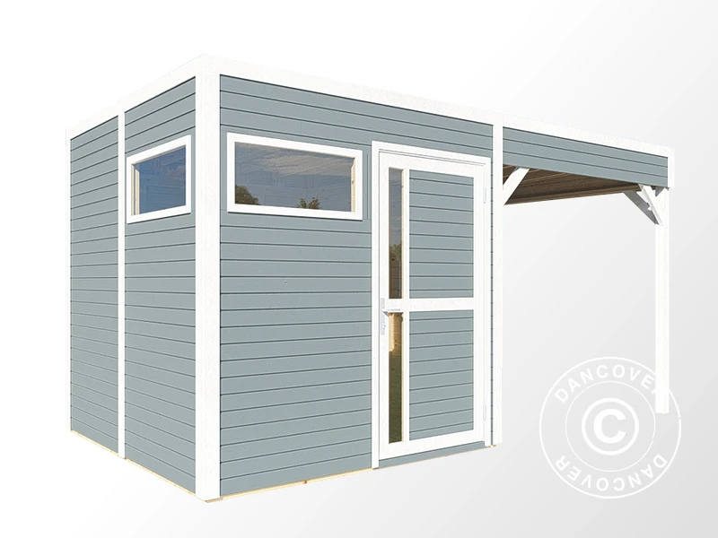 Avec cet élégant et moderne abri en bois avec surplomb, vous pouvez avoir vos outils de jardin, machines et vélos bien rangés, parfaitement assemblés et bien abrités en un seul endroit. La porte avec le panneau de fenêtre offre un accès facile et – grâce aux deux fenêtres – permet la lumière naturelle à l’intérieur de la remise pendant la journée. Vous pouvez verrouiller la porte avec la serrure à cylindre incluse.
