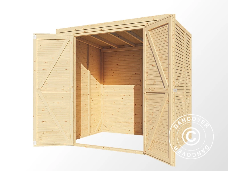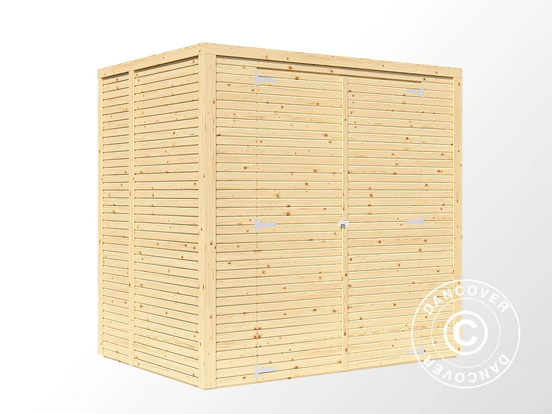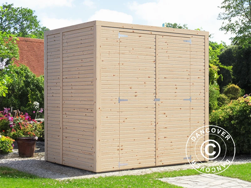 Abris en bois en épicéa nordique de 18 mm avec grande porte double pour un accès facile. Parfait pour les vélos, les machines de jardin, les poubelles et bien plus encore. L’abri a une serrure intégrée pour sécuriser le contenu. La conception moderne du panneau rend l’abri agréable et il peut être placé plus ou moins partout où vous avez besoin de stockage supplémentaire. L’abri en bois naturel doit être traité avec un agent de préservation du bois de haute qualité pour protéger le bois et le faire durer. Pour prolonger la durée de vie du bois, vous pouvez traiter l’intérieur avec une teinture de bois respirante.