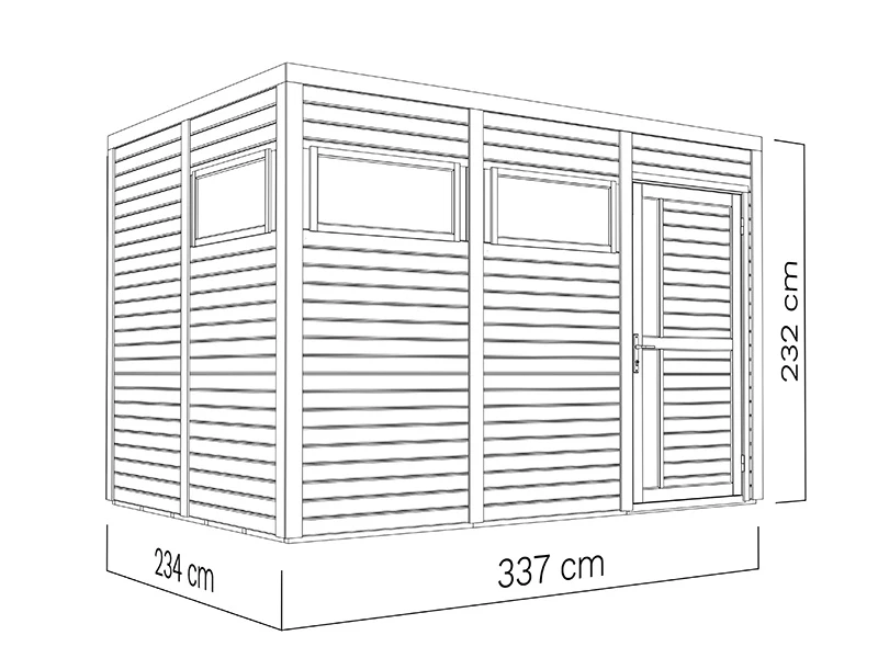 Un abri en bois élégant et moderne en bois massif 19 mm FSC de sources responsables. L’abri est fait de bois très stable, robuste et durable, qui durera longtemps, surtout si vous en prenez soin. L’abri en bois a un toit avec une pente de 2,2° afin que l’eau ne stagne pas. L’abri est livré avec un revêtement de toit temporaire, il est donc important que vous installiez des feutres ou des bardeaux de toiture permanents dans les quelques semaines suivant l’assemblage.