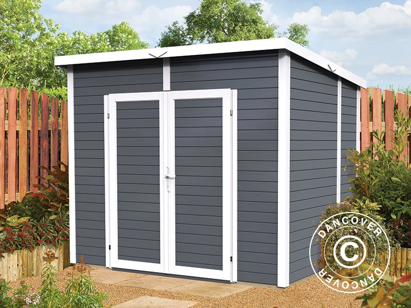 Le plancher inclus est constitué de panneaux de plancher MFP P5 de 16 mm, résistants à l’humidité et très durables, qui sont faciles à assembler. L’ensemble de l’abri est préfabriqué et vous pouvez l’assembler en un rien de temps sans avoir à utiliser d’outils spéciaux. Nous vous recommandons d’être deux pour ce travail. La double fixation des cadres entre les panneaux dans les coins de l’abri de jardin assure une grande stabilité. Veuillez noter que vous pouvez incliner le toit dans la direction que vous préférez — en l’éloignant de la porte ou en le rapprochant de celle-ci. L’abri de jardin est livré avec une toiture préliminaire, ce qui nécessite que vous couvriez l’abri de jardin avec une toiture permanente dans les deux mois suivants l’installation. L’inclinaison du toit empêche l’eau de s’accumuler sur le toit et de causer des dommages.