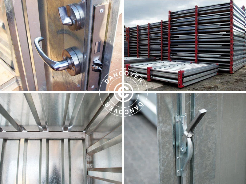 Les deux portes à vantaux sont en acier galvanisé ondulé de 0,75 mm et riveté aux supports en acier de la porte. Les cadres sont en acier galvanisé de 1 mm. La porte est sécurisée par un levier de traction, une poignée de porte, une serrure avec clapet et une protection contre le gauchissement. Le plancher est composé de planches à languettes et rainures en bois de 35 mm, les côtés du plancher sont fixés à des supports horizontaux en acier. Les conteneurs de 2,25 m et 3 m peuvent également être commandés avec un fond galvanisé à chaud de 3 mm avec une surface antidérapante.