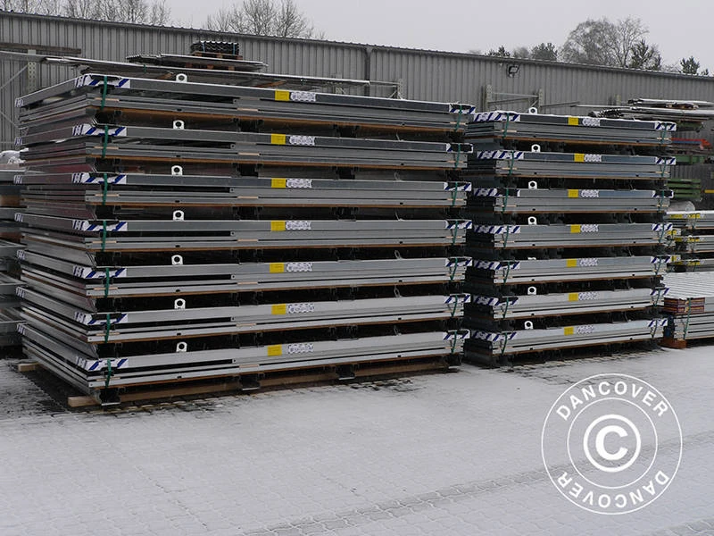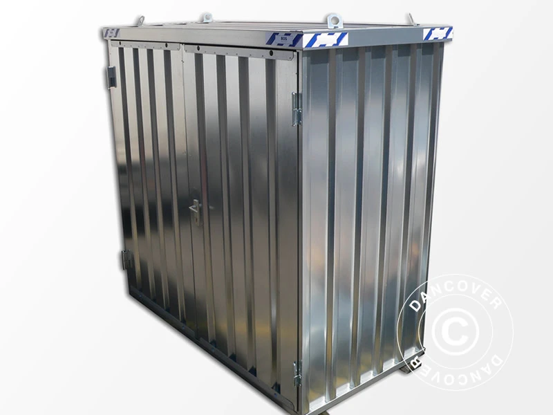 Nos conteneurs de stockage robustes et flexibles sont la solution idéale lorsque vous avez besoin d’un espace supplémentaire pour un stockage sûr, à l’extérieur ou à l’intérieur. Les conteneurs peuvent être montés et démontés facilement, sans outils. Cela signifie que vous pouvez toujours ajuster votre capacité de stockage en fonction de l’évolution de vos besoins. Le conteneur est doté d’un solide plancher en bois OSB d’une capacité de charge de 500 kg/m². La porte à double battant à l’avant facilite l’accès. Les parois des conteneurs de stockage sont en acier galvanisé ondulé de 0,8 mm d’épaisseur, tandis que les profils ont une épaisseur de 1,5 mm/2 mm. Les quatre anneaux de levage pour faciliter le transport sur site et les glissières métalliques pour le transport par chariot élévateur et les ventilations au sol font de ces conteneurs l’une des meilleures solutions de stockage du marché. Les conteneurs sont parfaits pour les chantiers, les entrepôts, les espaces de stockage, le self-stockage et bien d’autres choses encore. Le conteneur supporte une charge de neige jusqu’à 2,10 kN/m².
