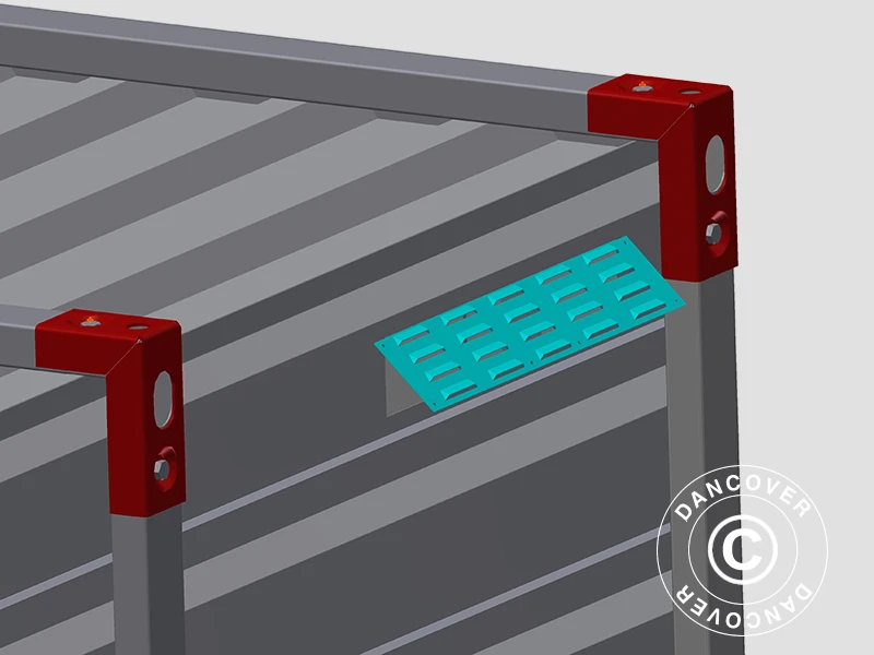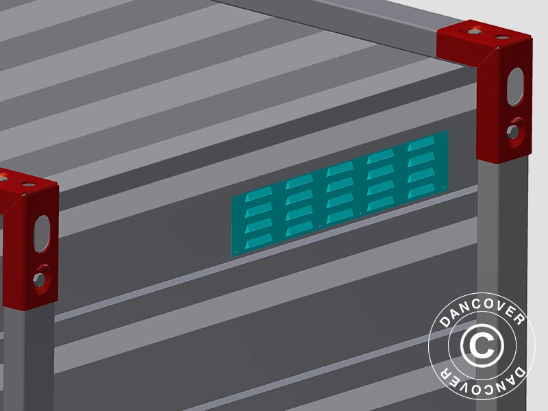 Si vous voulez installer des grilles d’aération dans votre conteneur, vous devez commander les grilles et les installer pour la ventilation vous-même – y compris couper un trou et monter la grille avec quatre rivets aveugles. La grille d’aération est faite en acier galvanisé d’1mm d’épaisseur sur une surface totale de 55cm2 et avec 20 trous d’air. Il est possible de placer une paire (2 pcs) ou plus encore de grilles sur le côté du container.