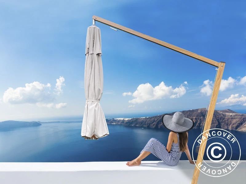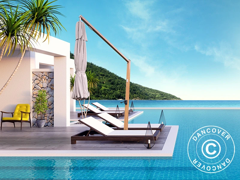 Parasol porte à faux moderne et élégant dans des matériaux durables. Créez une ambiance cosy et exclusive avec ce parasol en porte à faux beau et durable. Le parasol en porte à faux est un parasol de luxe de haute qualité doté d’un cadre en aluminium robuste et d’un poteau de parasol avec un système d’enroulement intégré pour faciliter l’ouverture et la fermeture du parasol. Ce grand parasol autoportant vous offre une ombre agréable toute la journée en raison de la toile étendue. Comme le poteau est positionné sur le côté au lieu du milieu, il est facile d’organiser un salon ou une salle à manger sous le grand parasol. La toile imperméable et résistante aux UVs rend ce parasol en porte à faux moderne adapté à un usage résidentiel et commercial. Le beau design moderne sera magnifique sur n’importe quel patio ou dans n’importe quel restaurant et fournira une protection parfaite pour vos invités.