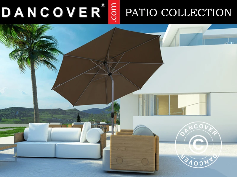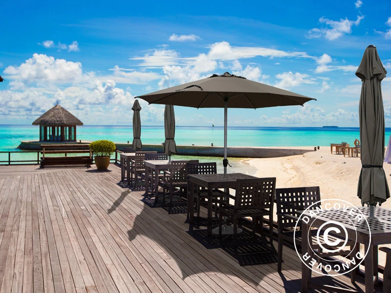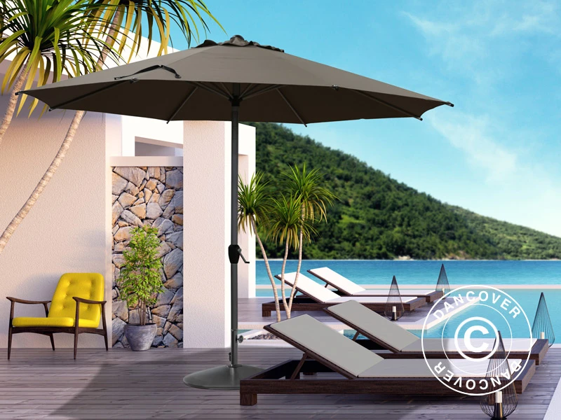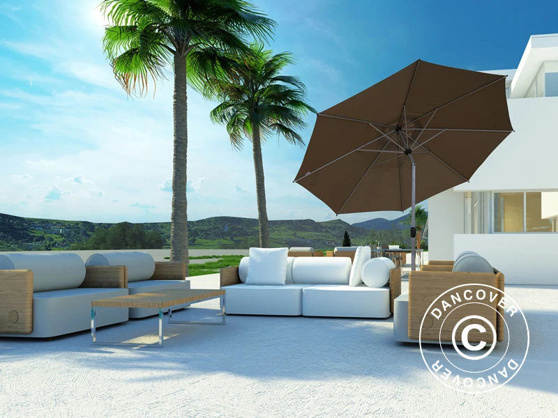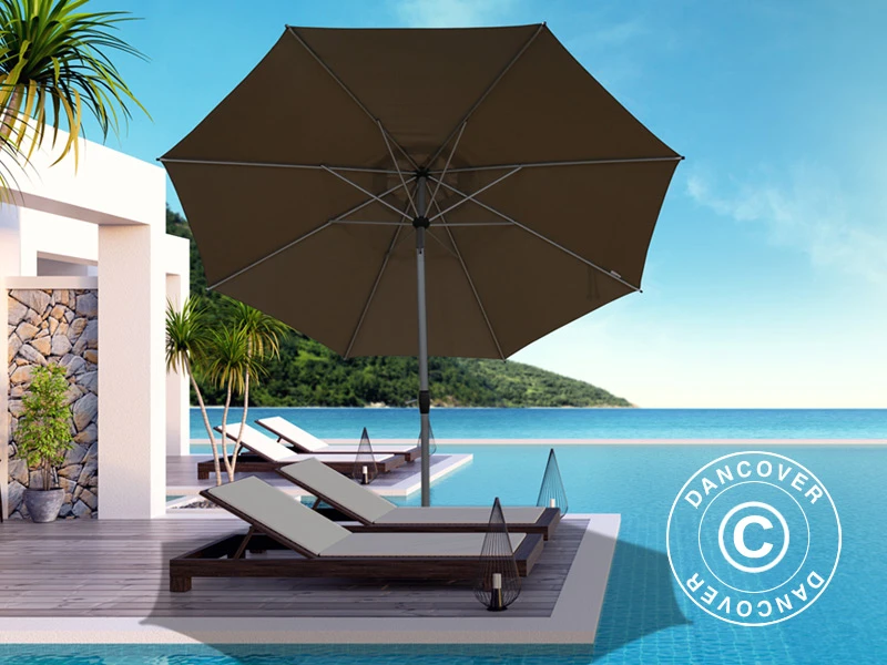 Parasol élégant au design classique et élégant qui ajoutera une ombre agréable et du style à la plupart des terrasses et jardins. Le mât en aluminium thermolaqué et les solides baleines en acier sont faits pour durer. Le tissu est un polyester de haute qualité 180 g/m² protégé contre les UV. Vous pouvez utiliser cet élégant parasol comme unité indépendante (veuillez noter que le parasol est livré sans base) ou à travers un trou dans la table à manger — min. Ø 48 mm. Le grand parasol présente une taille qui fournira une ombre agréable et comme il est inclinable, vous pouvez l’utiliser toute la journée. Le système de manivelle permet d’ouvrir et de fermer facilement le parasol. Le parasol est équipé d’un coupe-vent au sommet et le mât en aluminium de Ø48 mm s’adapte à la plupart des bases de parasol standard. Le mât peut être séparé en deux parties, ce qui facilite le transport et le rangement du parasol lorsqu’il n’est pas utilisé.