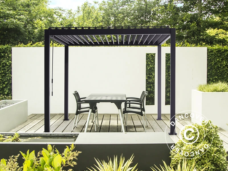 Cette tonnelle ou cette pergola bioclimatique haut de gamme aura un aspect étonnant dans la plupart des endroits — dans votre jardin, sur la terrasse, au bord d’une piscine, etc. L’aspect moderne et élégant s’adaptera partout, et vous pourrez l’utiliser aussi bien pour vous abriter de l’ombre que d’un peu de pluie. Vous pouvez ouvrir ou fermer le toit à lamelles innovant en utilisant les manivelles à l’intérieur de la tonnelle. Ouvrez les lamelles lorsque vous voulez profiter du soleil et refermez-les pour vous mettre à l’ombre ou vous abriter d’un peu de pluie. La tonnelle est étanche et résistante aux UV.