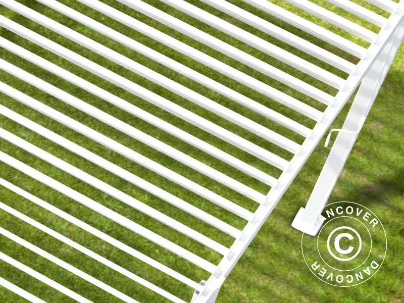 - Informations sur la garantie: La garantie Dancover s’applique uniquement à l’utilisation normale du produit, à l’exception de l’usure normale, conformément aux instructions d’utilisation écrites ou au manuel. Si vous devez nettoyer votre tonnelle/pergola à un moment donné, utilisez uniquement un détergent doux et de l’eau tiède ou froide. N’utilisez pas d’agents forts, quels qu’ils soient.