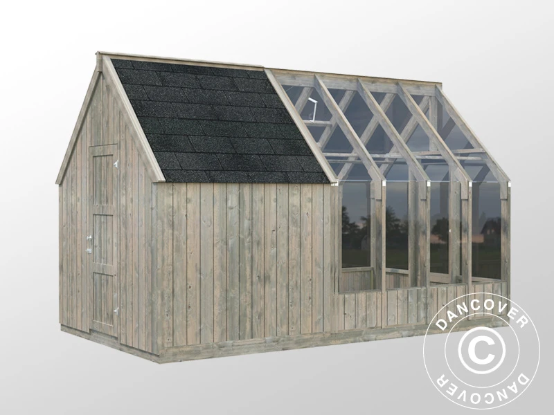Une serre ou une tonnelle en bois unique et exclusive avec un abri intégré en épicéa nordique traité sous pression. Les grandes baies vitrées offrent un incroyable apport de lumière, ce qui vous permet d’utiliser la structure comme une serre ou un refuge, selon vos besoins. L’abri intégré permet de ranger tous vos outils et accessoires de jardin. Cette belle structure se fondra dans le paysage et prolongera la saison de jardinage. Vous disposerez d’une pièce exquise pour vous détendre et cultiver de délicieux produits comme des fruits, des légumes et de belles fleurs.