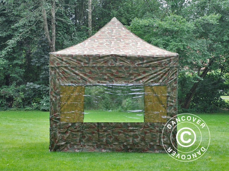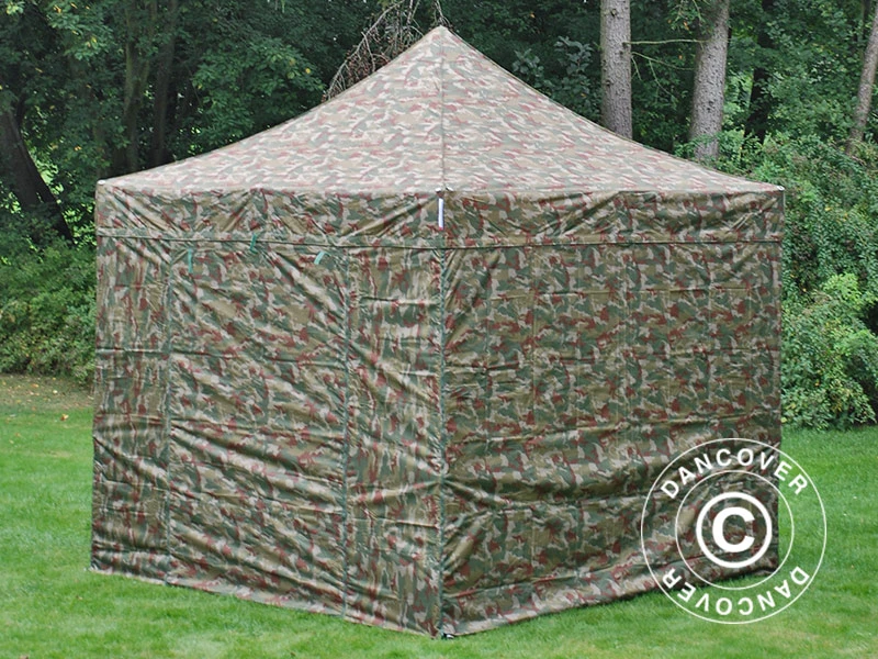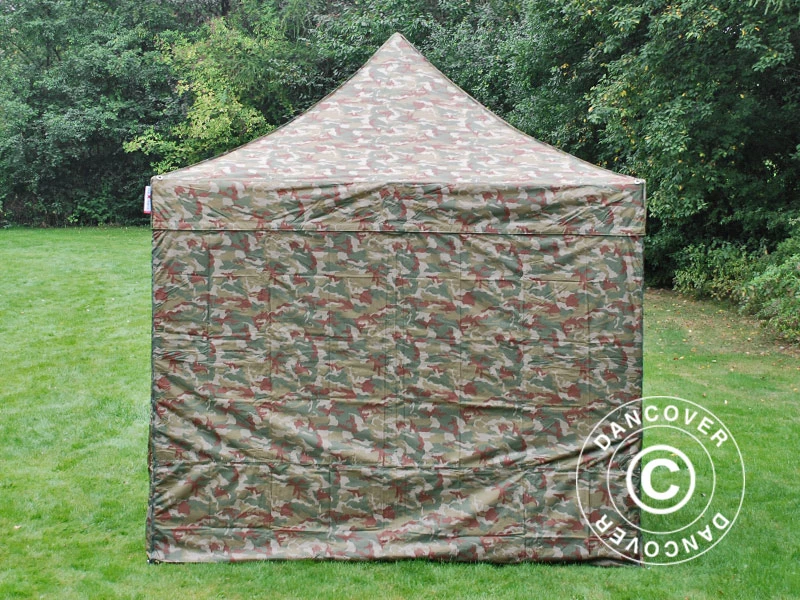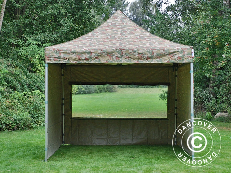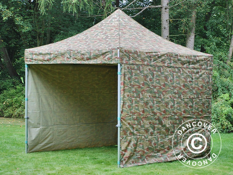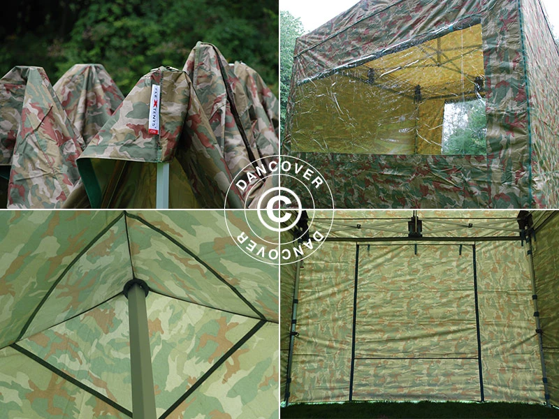 Cette unique FleXtents de style camouflage est idéale pour la chasse, les salons du jeu, les activités avec un lien au militaire et autres activités de plein air. Ce style très reconnaissable se fond dans tous les lieux de nature et donnera un signe fort lorsque la tente est utilisée lors d’un lancement de produit ou sur un salon.