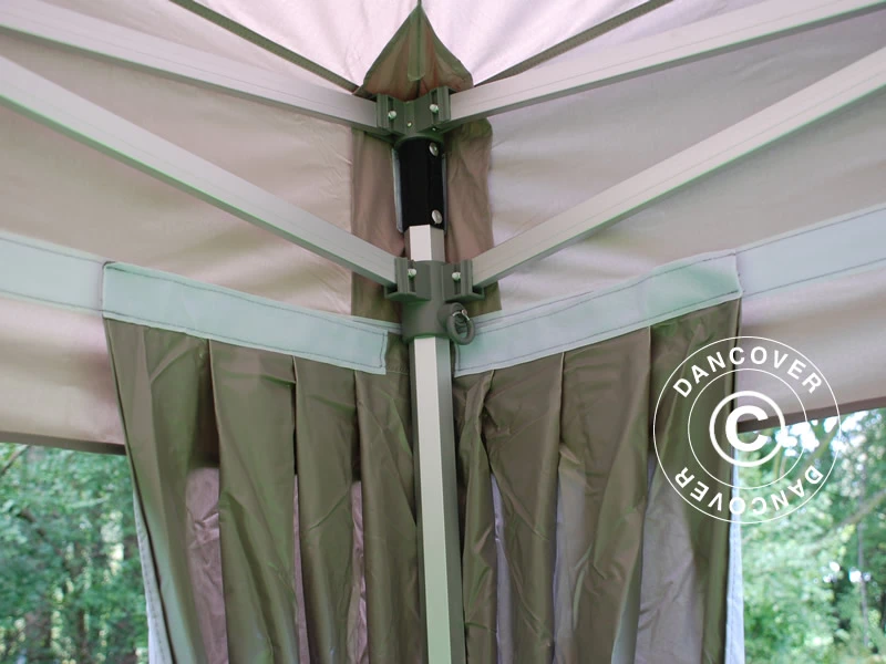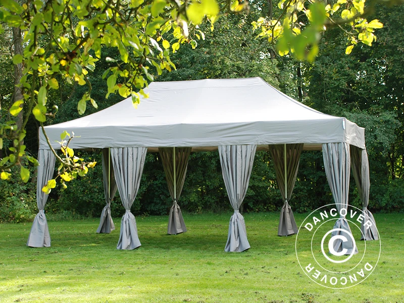 - Quand il pleut, il y a un risque d’accumulation d’eau sur la toiture, ce qui peut causer l’effondrement de la structure. Il en va de votre responsabilité de retirer l’eau du toit. Faites en sorte que la toile de tente soit toujours bien tendue et, le cas échéant, retirer l’eau accumulée sur le toit.