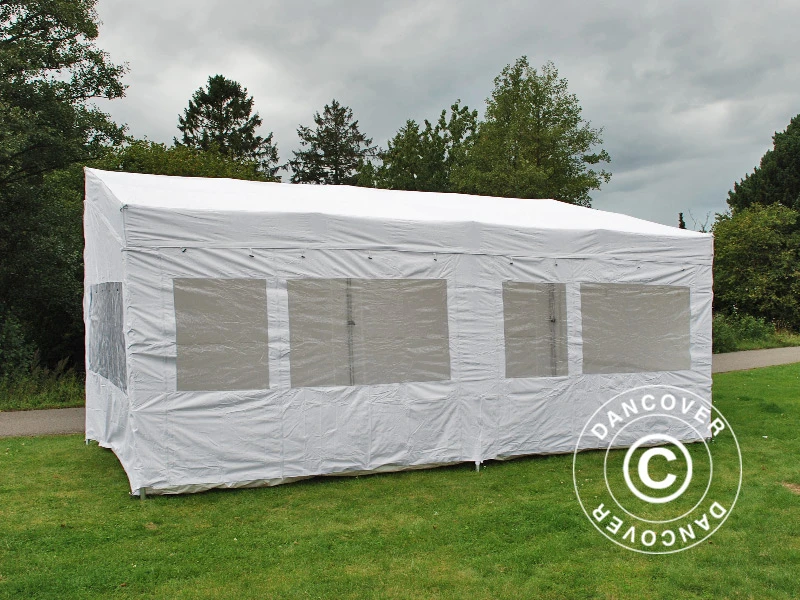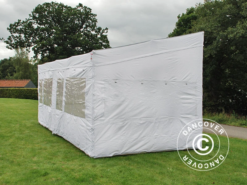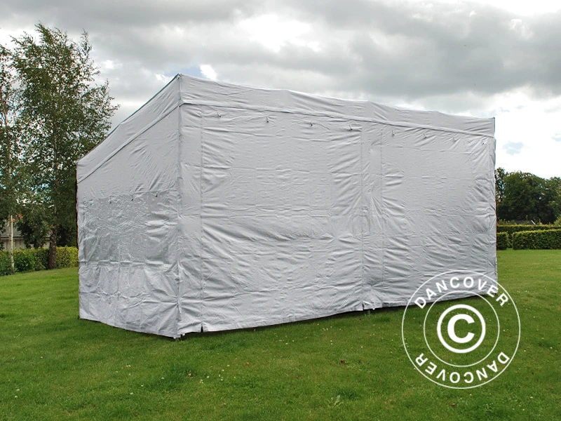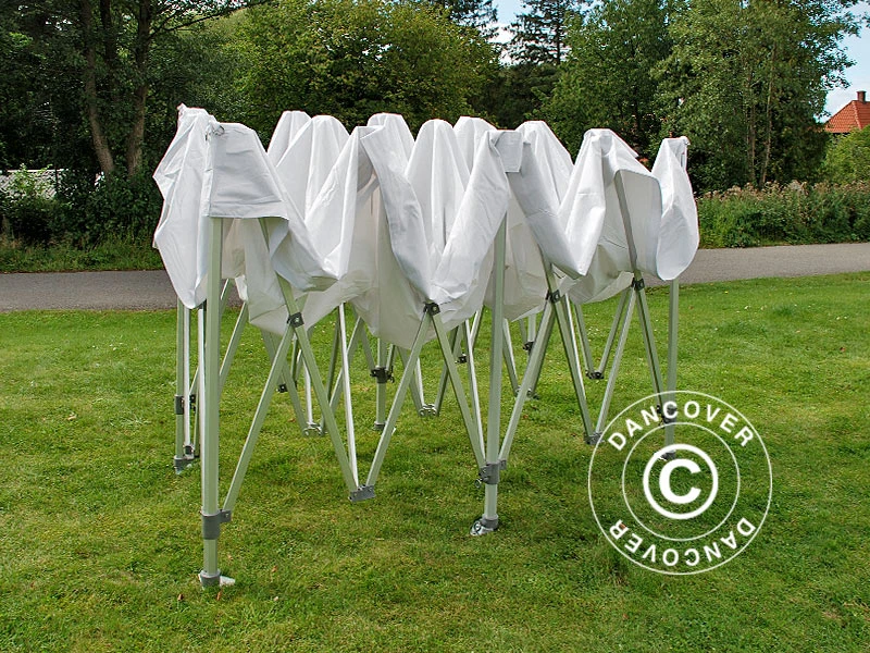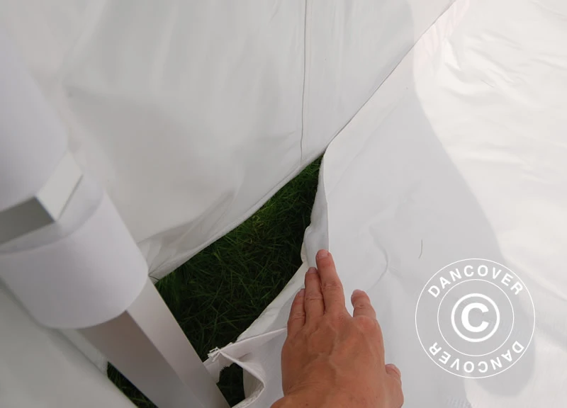 - Quand il pleut, il y a un risque d’accumulation d’eau sur la toiture, ce qui peut causer l’effondrement de la structure. Il en va de votre responsabilité de retirer l’eau du toit. Faites en sorte que la toile de tente soit toujours bien tendue et, le cas échéant, retirer l’eau accumulée sur le toit.