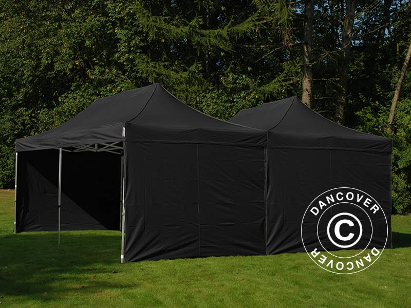Les deux châssis robustes sont faits de tubes d’acier hexagonaux robustes pour une résistance et une durabilité maximales. Il vous suffit de combiner les deux tentes pliantes en une seule tente unie grâce aux deux connecteurs, de fermer les panneaux des joints de remplissage, et d’utiliser la gouttière pour sceller la tente. Les grands repose-pieds assurent un ancrage stable et solide lors de la mise en place. La hauteur des FleXtents est réglable en 3 positions différentes, ce qui permet de l’adapter exactement à vos besoins. La couverture est faite de polyester solide de haute qualité — la toile de toit présente un support en PVC. Les parois latérales présentent de grandes fenêtres de style géorgien pour fournir un flux de lumière parfait. La housse est imperméable, résistante aux UV, aux taches et lavable !