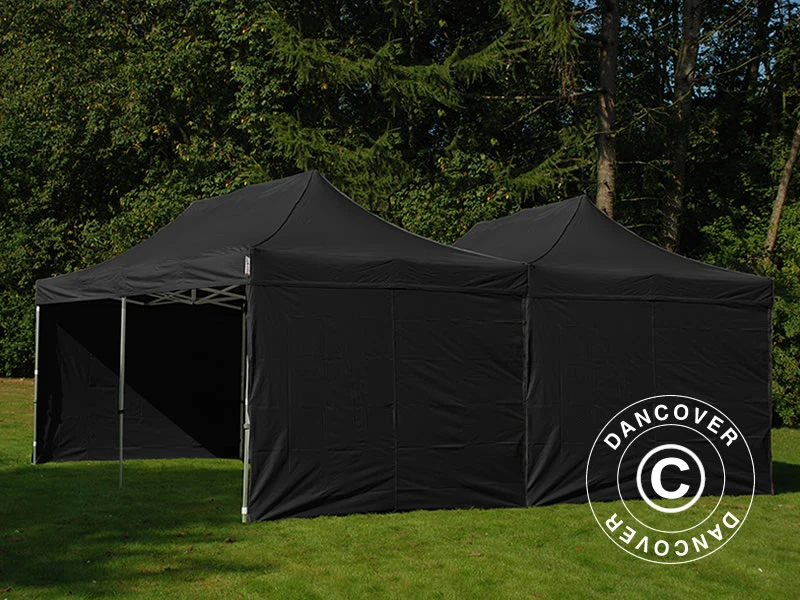 Les deux châssis robustes sont faits de tubes d’acier hexagonaux robustes pour une résistance et une durabilité maximales. Il vous suffit de combiner les deux tentes pliantes en une seule tente unie grâce aux deux connecteurs, de fermer les panneaux des joints de remplissage, et d’utiliser la gouttière pour sceller la tente. Les grands repose-pieds assurent un ancrage stable et solide lors de la mise en place. La hauteur des FleXtents est réglable en 3 positions différentes, ce qui permet de l’adapter exactement à vos besoins. La couverture est faite de polyester solide de haute qualité — la toile de toit présente un support en PVC. Les parois latérales présentent de grandes fenêtres de style géorgien pour fournir un flux de lumière parfait. La housse est imperméable, résistante aux UV, aux taches et lavable !