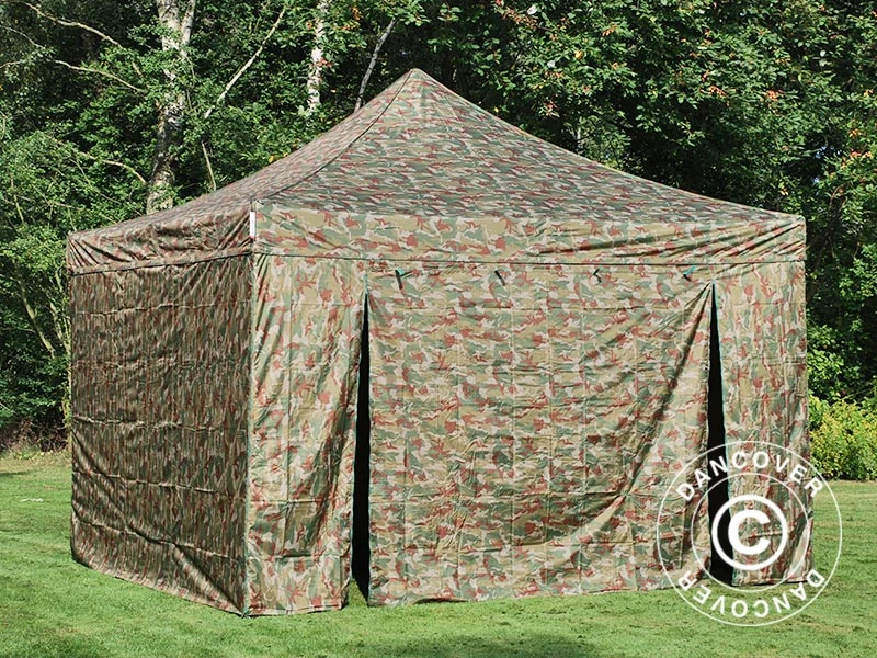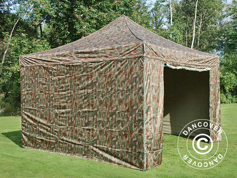 Cette unique FleXtents de style camouflage est idéale pour la chasse, les salons du jeu, les activités avec un lien au militaire et autres activités de plein air. Ce style très reconnaissable se fond dans tous les lieux de nature et donnera un signe fort lorsque la tente est utilisée lors d’un lancement de produit ou sur un salon.