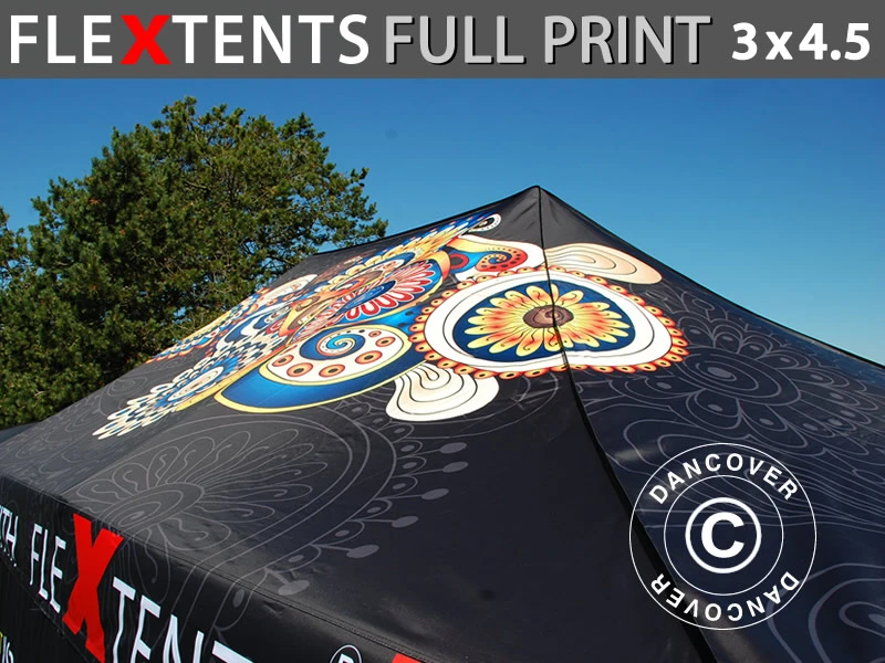 Toile de toit imprimée avec cantonnière pour tente pliante FleXtents® PRO avec impression numérique complète. Avoir une tente pliante professionnelle avec votre design imprimé numériquement sur la toile de toit créera une solution de branding professionnel hautement efficace et optimale ! L’impression numérique est la solution la plus durable et exclusive pour votre tente pliante FleXtents®.