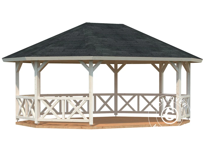 Une tonnelle en bois solide et durable pour une salle à manger ou un coin salon où vous pourrez profiter du jardin à l’ombre et à l’abri d’une petite pluie ou de la rosée qui tombe la nuit. Une tonnelle solide et élégante avec un plancher en bois et une rampe en bois sur 7 côtés.