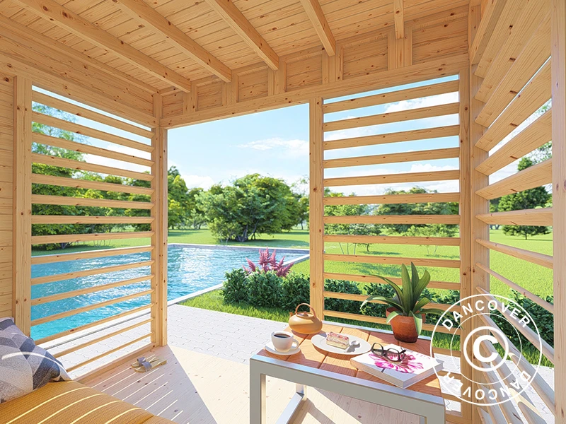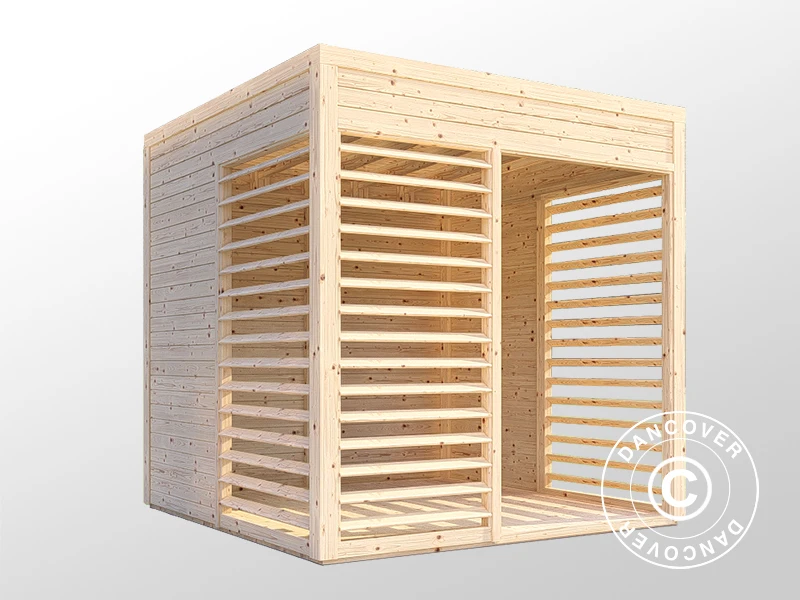Une tonnelle élégante, robuste et carrée en épicéa nordique (Picea Abies) massif de 19 mm dans un design de panneau solide et robuste. Tous les panneaux et composants sont préfabriqués et ne nécessitent donc aucune découpe. Le bois est labellisé FSC, ce qui signifie qu’il provient de sources responsables. Utilisez le cube pour la détente, l’ombre et l’abri dans votre jardin ou ailleurs. Placez l’élégante tonnelle sur une terrasse pour pouvoir l’utiliser en combinaison avec une salle à manger, un coin salon ou le jardin en général. La tonnelle en bois massif offre de l’ombre au soleil et un abri contre la pluie. La tonnelle est livrée avec un revêtement de toiture préliminaire seulement, il est donc important que vous installiez une toiture permanente dans les un ou deux mois à venir.