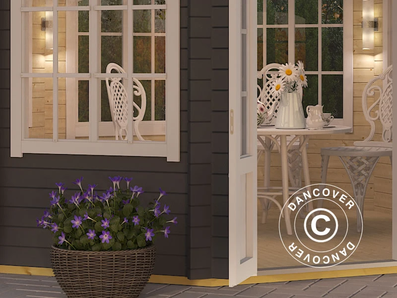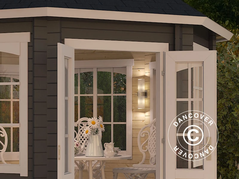 Une tonnelle octogonale en bois massif nordique sélectionné de 44 mm de qualité. Comme le bois pousse lentement dans les régions les plus froides d’Europe, votre tonnelle est fabriquée dans un matériau très stable, robuste et durable, qui durera longtemps, surtout si vous en prenez soin. L’élégante tonnelle en bois avec de grandes fenêtres et une double porte deviendra bientôt le point de rencontre naturel dans votre jardin. Utilisez-la pour la détente et la contemplation, pour le travail ou pour recevoir vos amis et votre famille.